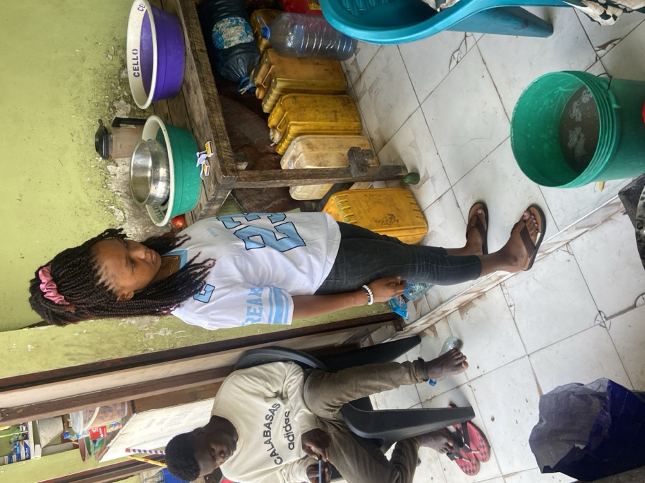The scene depicts a semi-outdoor or covered area, likely a veranda or service space, in Dar es-Salaam, Tanzania. The environment features a pale green painted wall, visibly weathered and peeling, set against a white tiled floor. A young woman stands centrally, facing slightly right and looking downwards. She has dark braided hair styled in a high ponytail, secured with a pink scrunchie. She wears a white, light blue, and grey short-sleeved jersey-style shirt displaying "BREAK" and the number "23," dark-colored fitted trousers, and brown flip-flops. A white beaded bracelet is visible on her left wrist. To the left of the frame, a young man is seated on a black plastic chair, his body oriented left, engrossed in a smartphone he holds in both hands. He is dressed in a cream-colored long-sleeved sweatshirt with "CALABASAS adidas" printed on the chest and dark trousers. He wears red and black flip-flops on his right foot, while his left foot is bare. Behind the standing woman and against the green wall, a rudimentary wooden shelf unit is present. The top shelf holds a metal bowl, a green plastic basin, a grey plastic blender, and a purple plastic basin labeled "CELLO." Two small red matchboxes are also on the shelf. Below the shelf, on the tiled floor, are several yellow plastic jerrycans and a large blue plastic water bottle. In the lower right foreground, a green plastic bucket filled with murky liquid is visible. A small, dark green, oval-shaped fruit lies on the floor near the jerrycans. The far left background reveals a partial view of a wooden doorframe or partition and shelves stocked with various containers, indicating a commercial or storage area. The two individuals are present but not interacting; each is engaged in a separate activity.