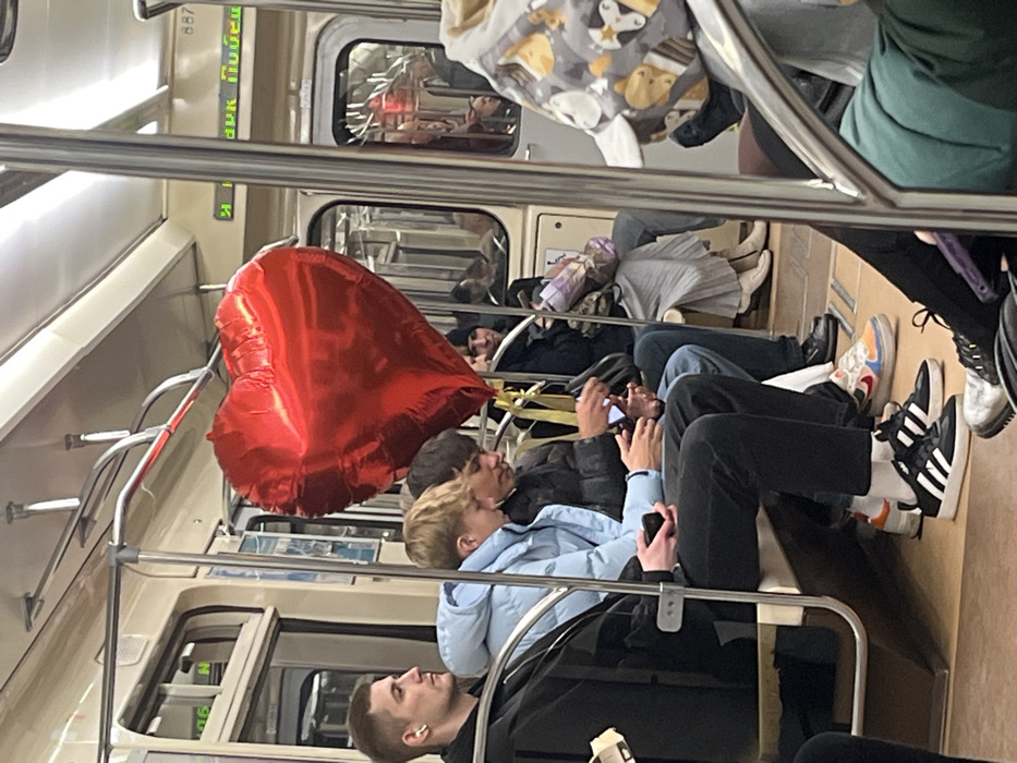 - "The scene depicts the interior of a metro train car in Saint Petersburg, Russia, indicated by the digital display showing "Парк Победы" (Park Pobedy), a metro station in that city" by FM-UXihg1, licensed under CC BY 4.0