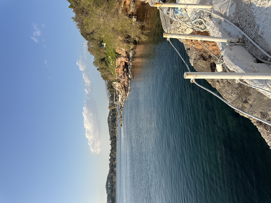 The image displays a coastal scene within the Vouliagmeni Municipal Unit, Greece, under a clear, bright blue sky with scattered white cumulus clouds. The foreground and left half of the frame are dominated by a calm, deep blue-green body of water, indicating the Aegean Sea. The water's surface exhibits subtle ripples, and its clarity allows visibility of the rocky seabed near the immediate shore. Along the right side, a rugged coastline features reddish-brown rock formations and cliffs, heavily vegetated with green trees and shrubs that extend to the water's edge. Some small caves or overhangs are present in these rock formations. In the immediate right foreground, a weathered concrete pathway or ledge runs parallel to the water. This pathway features five white-painted metal posts, exhibiting rust at their bases and tops, connected by a taut white wire or rope, functioning as a rudimentary barrier. The concrete shows signs of wear, including cracks and faint patches of blue and white paint. In the mid-ground, along the distant coastline to the left, a series of structures are visible. These include a large, multi-story building situated on a vegetated hill to the far left, and further along the coast, smaller buildings and what appears to be a white-roofed, open-air structure, possibly a cafe or restaurant, extending towards the water on a pier or platform. The distant hills behind this coastline are also covered in dense green vegetation. No individuals are present in the scene. Sunlight illuminates the scene from the left, casting distinct shadows.