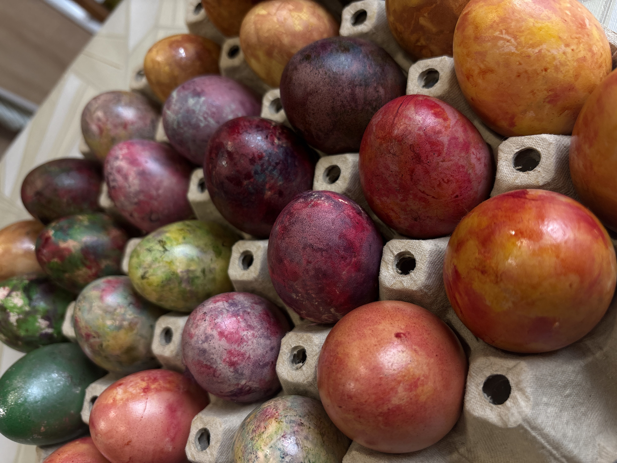 - "A high-angle close-up shot shows a cardboard egg carton filled with dyed eggs of varying colors and patterns" by FM-kIRSA3, licensed under CC BY 4.0
