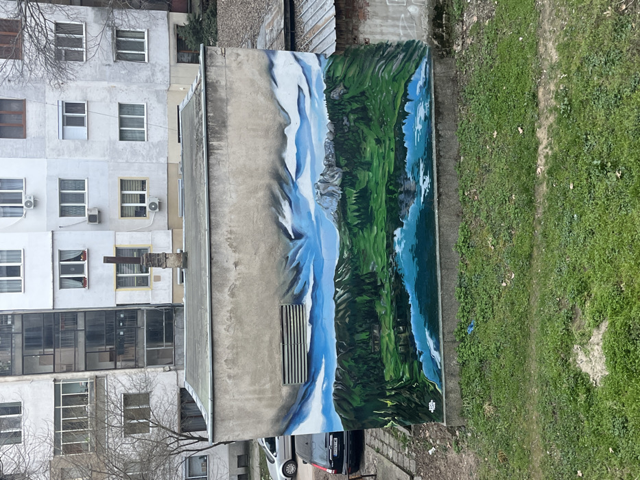 The image displays a single-story, light gray concrete utility building situated in Pleven, Bulgaria, facing a patch of overgrown green grass in the foreground. The building's front facade features a detailed landscape mural depicting a mountainous scene with a lake. The mural covers the entire visible front wall, portraying a sky with blue patches and white-gray clouds at the top. Below, a range of green, forested mountains with prominent gray rock formations and peaks rises. In the lower portion of the mural, a still, deep blue lake reflects the surrounding mountains and sky. A horizontal metallic louvered vent is present on the upper left section of the building's actual wall, interrupting the painted clouds. The building has a flat, dark gray roof with a single, slender, dark brown metal chimney pipe extending upwards near its center. To the left of the utility building, a dark-colored station wagon (black Volvo, Bulgarian license plate "BH 0091 MB") is parked on an unpaved surface. Further left and partially obscured, a light-colored sedan is visible. Bare-branched deciduous trees are scattered in the mid-ground. In the background, two multi-story residential apartment buildings, light gray/off-white in color, dominate the upper frame. These buildings feature numerous windows, some with exterior blinds or interior curtains, and several window-mounted air conditioning units. One section of the apartment building immediately behind the utility structure has a multi-story glass-enclosed balcony or extension. To the right of the utility building, a low, dilapidated structure with a corrugated metal roof and exposed brick/concrete walls, showing signs of graffiti, is partially visible. The immediate foreground consists of uneven green grass with visible dirt patches and a small blue plastic object near the base of the mural.