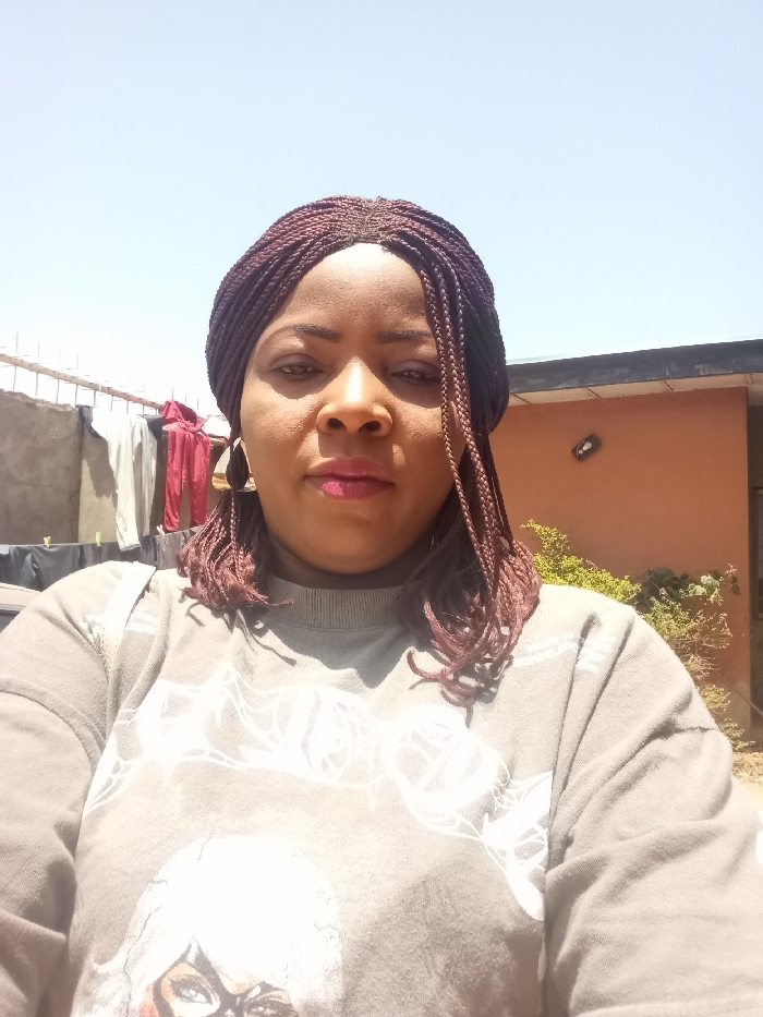 An adult female is depicted in a close-up, outdoors under a clear blue sky, in Sabon Tasha, Nigeria