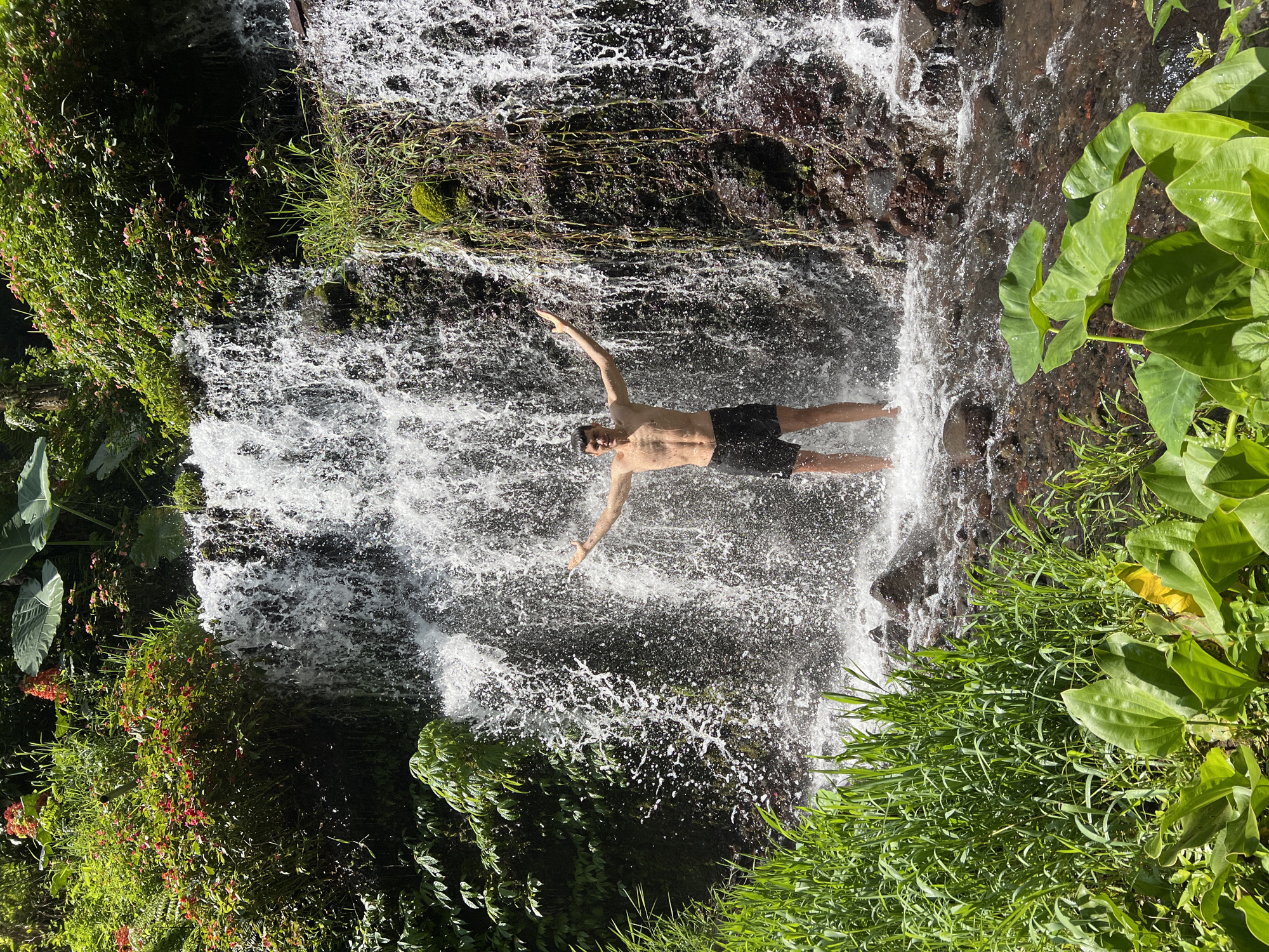 A man in black shorts stands beneath a waterfall with arms outstretched, appearing to revel in the cascade