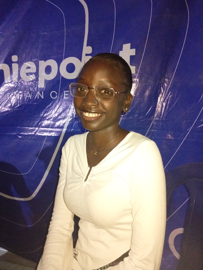 A young woman smiles wearing glasses, a white long-sleeved shirt, and a delicate necklace. She has short hair and dark skin. She sits in front of a blue backdrop with a white logo and swirling lines. The light appears to be low, creating shadows and highlights on her face and clothing.