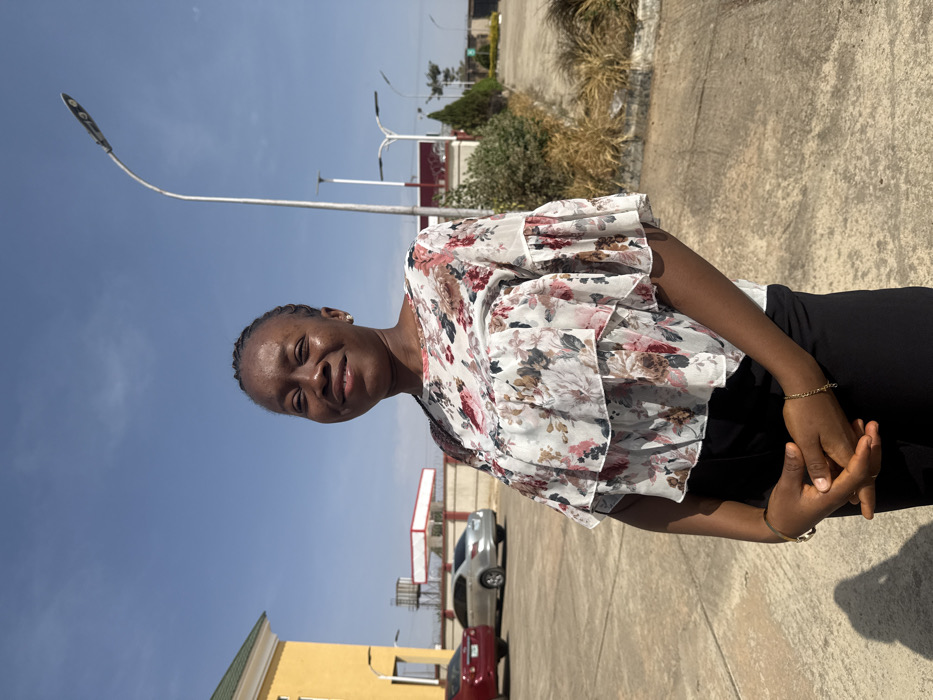 A female individual stands centrally in a paved outdoor area under a clear blue sky in Jos, Nigeria