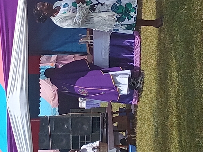 This image captures an outdoor scene in Lumakanda ward, Kenya, featuring elements of a gathering or ceremony. The ground is covered in green grass under natural light. In the upper portion of the frame, a large white canopy tent is partially visible, with its roof extending across the top. Behind it, a smaller tent constructed from various colored fabrics, including light blue, red, pink, dark blue, and purple, is erected. Three individuals are present. On the far left, a person in a white garment is partially visible, seated behind a wooden table. A light-colored woven basket rests on the table, and a blue basin is situated on the ground near their feet. To the left of this seated individual, a stack of at least three dark audio speakers, each with multiple circular drivers, is prominent. In the center, a person is observed from the rear, wearing a dark purple chasuble or similar liturgical vestment with a lighter purple lining or stole, which features an embroidered emblem on the back. A white undergarment is visible beneath the purple vestment, and the individual wears dark boots. This person is positioned in front of a table draped in dark purple fabric with a light purple trim. On this table, several metallic candle holders are present. To the right, a woman stands in profile, facing left. She is dressed in a long-sleeved, light-colored dress adorned with a green floral or leaf pattern, over which a white lace overlay or cardigan is worn. Her dark hair is styled up, and she wears a necklace. Her bare feet are visible.