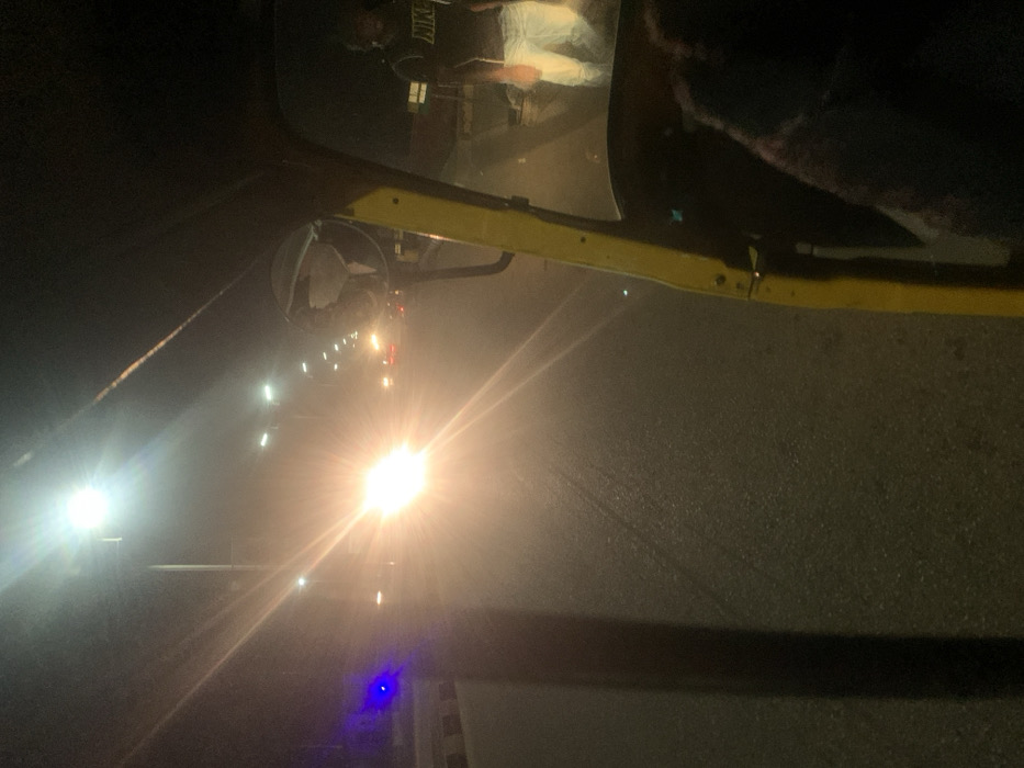 The scene captures a foggy night on a road with multiple car headlights blurring in the distance. The perspective is from within a vehicle, revealing a yellow bar structure overhead. In the corner of the image a rearview mirror reflects the interior of the same vehicle, capturing the partial view of a seated person wearing a light colored shirt. The road surface appears wet.