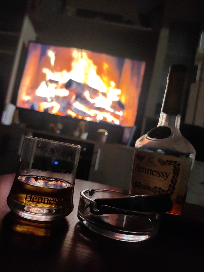 In Targovishte, Bulgaria, a dimly lit indoor scene displays a leisure arrangement. In the foreground, a clear glass tumbler, branded "Hennessy," holds an amber liquid, positioned to the left. Adjacent to it, a clear glass ashtray contains a single dark cigar. To the right of the ashtray, a clear glass bottle, also branded "Hennessy," stands upright, containing a similar amber liquid. All these items rest on a dark, reflective tabletop. In the background, a large television screen displays a high-definition image of a burning fireplace, complete with glowing logs and vivid orange flames, serving as the primary light source for the scene. The surrounding room is indistinct due to low light, revealing only blurred outlines of furniture. No individuals are visible.