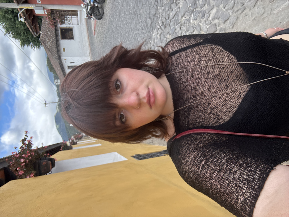 A young woman with brown hair and bangs poses for a selfie outdoors. She wears a black, sheer top and a delicate necklace. The background shows a cobblestone street, a yellow building with white accents and potted plants, and a distant mountain under a partly cloudy sky. A motorcycle is parked on the street. The image is taken from a slightly high angle and has been rotated.