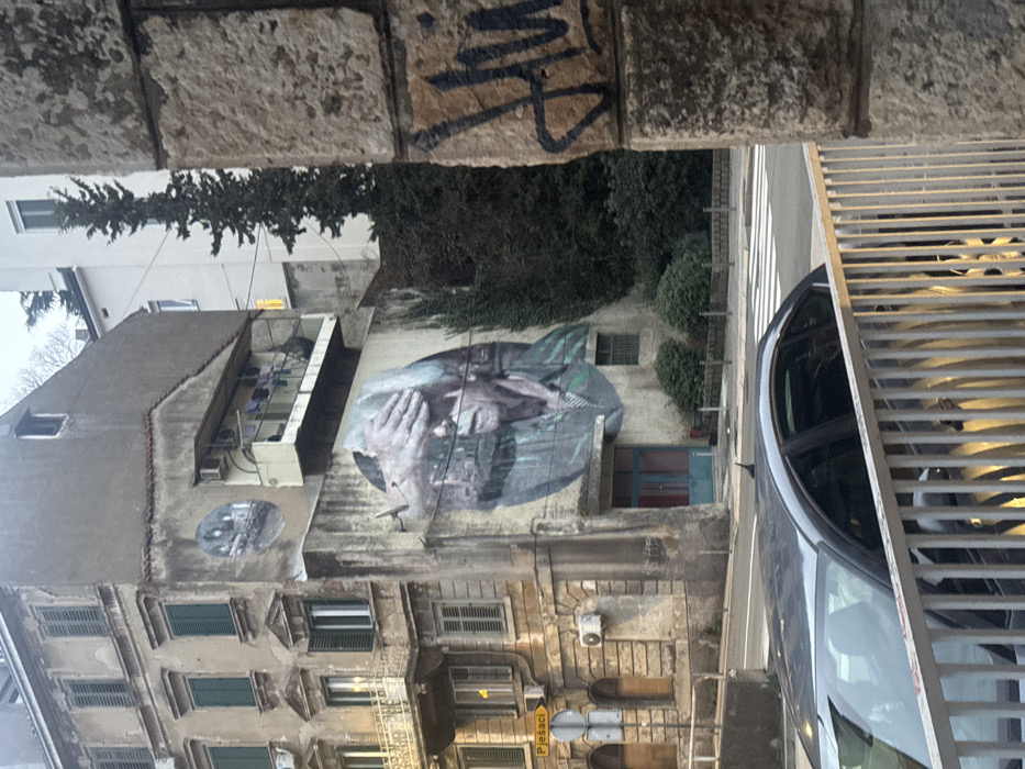 This image depicts an urban street scene in Grad Rijeka, Croatia, specifically featuring the "Porto Baroš" mural located on the building at Riva 16. The central focus is a large, circular street mural painted on a light-colored building facade. The mural portrays an older individual with grey hair, whose eyes are covered by a large hand, with a cityscape overlaid in the background. Above this, a smaller circular mural of an urban scene is visible, and to its right, an open balcony displays laundry hanging to dry. To the immediate left of the mural building stands an older, multi-story structure characterized by its ornate architectural details, numerous windows with closed green louvered shutters, and small balconies. A yellow street sign reading "Pješaći" (Pedestrians) is affixed to this building's lower wall, alongside an exterior air conditioning unit. In the lower center of the frame, the roof and upper section of a dark-colored sedan are visible, partially obscured by a light-colored metal railing in the immediate foreground. Beyond the vehicle, a paved road with a white pedestrian crosswalk and a line of street bollards is present. The far right of the image is partially framed by a rough, light-colored stone wall exhibiting visible mortar lines and black graffiti. In the background, behind the mural building, a tall, dark green conifer tree is present, with a plain white multi-story building visible further behind it against a light, overcast sky. No human figures are explicitly visible in the scene.