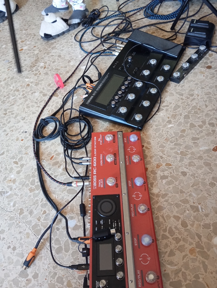 The scene depicts an indoor setting, likely a private residence or studio in Ripollet, Spain. The floor is covered with light-colored, mottled terrazzo tiles. Dominating the center are two primary pieces of electronic musical equipment. A black BOSS GT-1000 multi-effects processor is positioned in the upper center, featuring an integrated expression pedal, a digital display screen, numerous silver-capped footswitches, and control knobs. To its right, a smaller, black auxiliary pedalboard with three additional footswitches is connected. Below these, a red BOSS RC-600 Loop Station is prominently displayed, characterized by its bright red casing, central digital screen, several silver-capped footswitches (some illuminated with blue or purple light), and various control dials. A dense network of black audio, power, and USB cables interconnects these devices and extends across the floor. A single red cable tie secures a segment of a braided black cable in the upper left. In the upper left corner, a person's lower legs and feet are visible, clad in light-patterned pajamas and black and white panda-shaped slippers. A vertical black pole is partially visible on the far left edge of the frame. The arrangement indicates a setup for musical practice or recording.