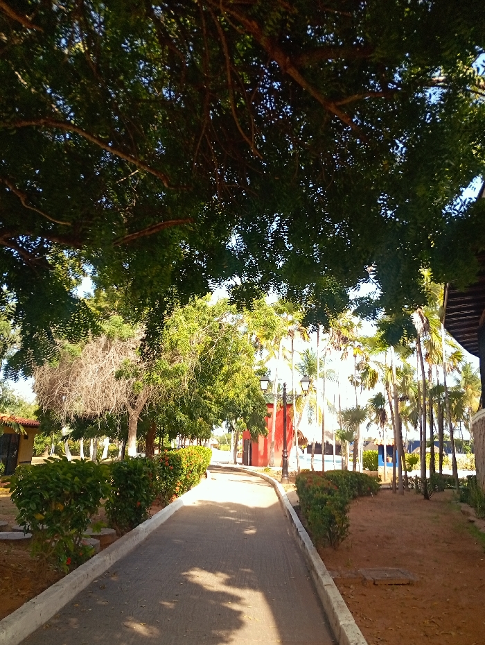 A path stretches into the distance, flanked by neatly trimmed hedges on both sides. Lush trees canopy the walkway, casting dappled shadows on the ground. A red building stands along the path, next to a black lamppost. Palm trees and other greenery fill the background. The scene is bathed in bright sunlight, creating a tropical and serene atmosphere.