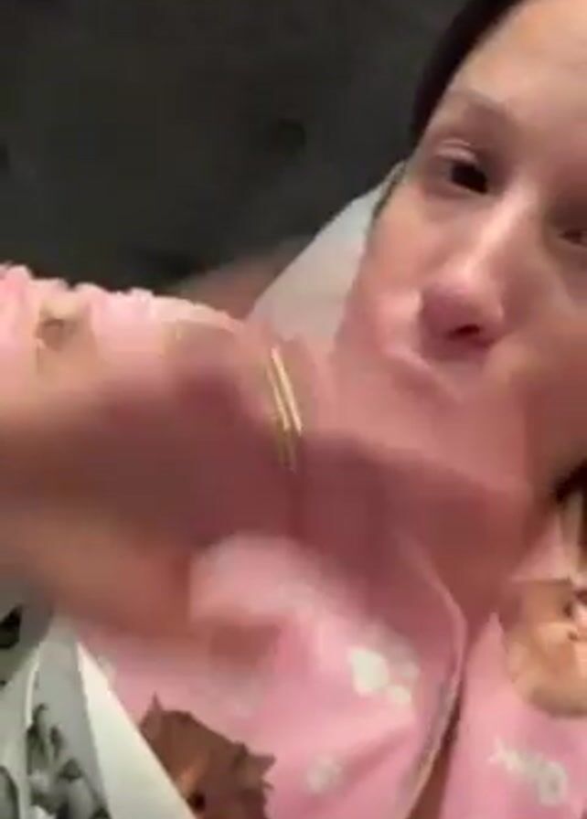 A woman in pink pajamas waves to the camera before making a hand heart. She is lying down on a pillow with her head resting on a headboard. The woman has dark hair and fair skin. Her pajamas are printed with images of a cat’s face, cat paw prints, and cat fish bones. The pajamas also have “Lola” printed on them. The woman makes a hand-heart gesture towards the camera.