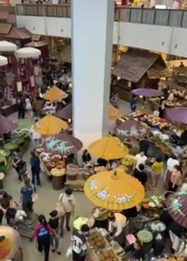 n aerial view of an indoor market situated within a larger shopping mall. The market features numerous stalls arranged in a dense configuration, with people browsing and interacting with vendors. Many stalls are shaded by traditional-style umbrellas in various colors including yellow, white, and maroon. The market stalls showcase a range of products, including food items, crafts, and other goods. The stalls are decorated to resemble traditional Thai structures. People are moving around the market, some shopping, some browsing, and others engaging in conversations. The overall atmosphere is lively and crowded. The shopping mall architecture is visible in the background, indicating the market is located within a larger commercial space. The scene is well-lit, contributing to a clear view of the market activities.