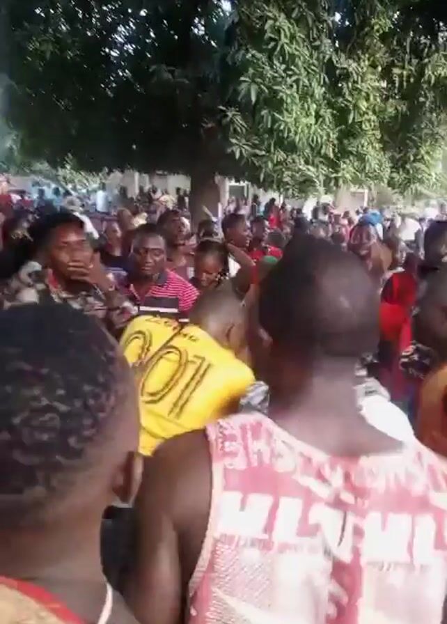A crowd of people are gathered together under a large tree. Many are dancing and moving to music, with at least one person drumming. Most people appear to be of African descent. The crowd consists of men and women of different ages, dressed in casual clothing, including patterned shirts, t-shirts with text, and tank tops. Some are holding up their phones, possibly recording. The tree has dense foliage, providing shade for the gathering. The ground appears to be dirt or grass.