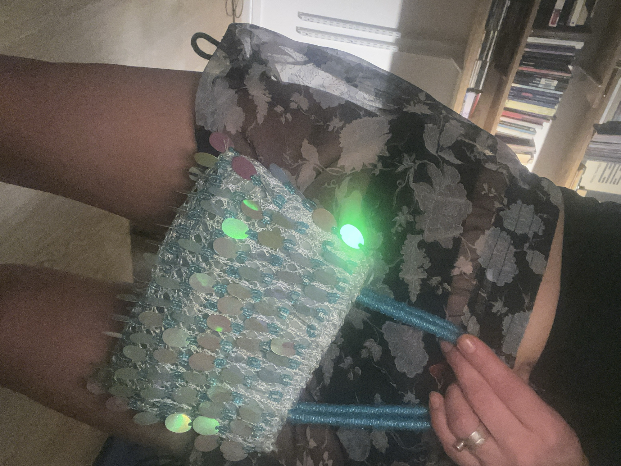 A person wearing a black floral dress is holding a small, sequined, turquoise bag. The bag has a handle and a few of the sequins are glowing green. The person is wearing a ring on their left hand. A leg is visible in the foreground. In the background, a bookshelf is visible. The location is not discernible from this image, nor is it possible to determine if the photo was taken in Buenos Aires, Argentina.