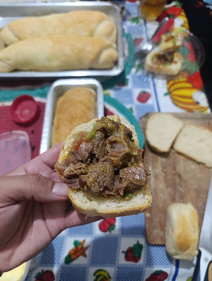 A hand holds a sandwich filled with shredded beef and vegetables. Behind it, there's a small loaf of bread, a cutting board with sliced bread, and a container with more of the shredded beef filling. Further back, there's a tray with several loaves of bread and a table covered with a patterned tablecloth. The overall scene is a homemade meal setting.