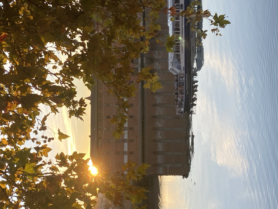 The image captures a backlit scene on the Garonne River in Toulouse, France, during what appears to be sunset or sunrise. The foreground is framed by the autumnal foliage of a plane tree, displaying yellow and orange leaves and some seed balls, with the sun's rays creating a starburst effect through the leaves on the left side. On the calm river, a white tour boat named "LE CAPITOLE" and bearing the inscription "LES BATEAUX TOULOUSAINS" is visible. Approximately 20-30 indistinct individuals are present on the boat's open upper deck. The boat and the sky are clearly reflected in the water's surface, which also shows subtle ripples. On the far bank, a large, multi-story brick building, identifiable as the Hôpital de La Grave due to its architecture and location, dominates the background. Its reddish-brown facade and numerous windows are reflected in the river. Behind this structure, a distinctive dome or spire, associated with the Hôpital de La Grave complex, is partially visible. The sky above is illuminated with warm orange and yellow tones, indicative of low sunlight.
