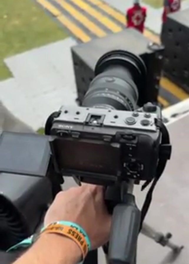 Sony camera set up on a tripod, pointed toward a crowd of people and a stage in the distance. There are several people wearing red and white uniforms walking in front of the crowd. A yellow and black striped walkway is visible between the camera and the crowd. The camera operator adjusts the angle of the camera. There are black speaker boxes surrounding the camera. The sky is overcast. The person operating the camera is wearing a wristband that reads "PRESS."