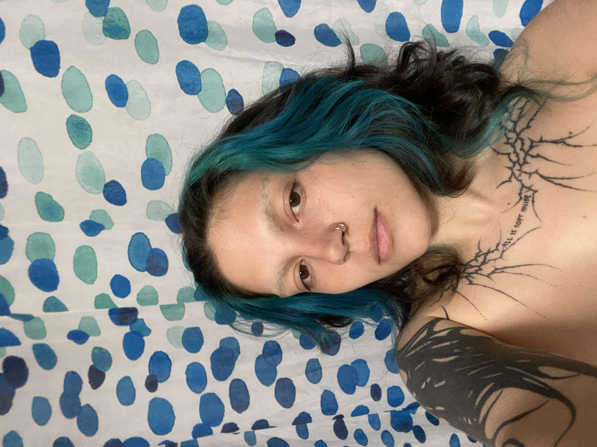 A single individual is depicted in a close-up, head-and-torso shot, facing directly forward. The subject has light skin, dark wavy hair with prominent teal-blue streaks, and bleached eyebrows. A silver hoop nose ring is present in the left nostril. Tattoos are visible on the left shoulder and upper arm, featuring a large, dark, abstract design. On the upper chest, a thorny, branch-like tattoo is centered, with the text "ALL IS SOFT INSIDE" inscribed above it. The individual appears partially unclothed. The background is a white surface patterned with irregular blue and teal-green oval shapes, consistent with a shower curtain. The specific location within Gijón/Xixón, Spain, cannot be determined from the provided visual information.