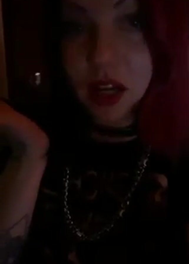 A woman is facing the camera. She is wearing dark lipstick, a choker, and a black t-shirt with a silver chain necklace. She has dark hair, though some sections are dyed red. Tattoos cover the back of her hand. She puffs at a cigarette and exhales the smoke. The background is dark. Music is playing.