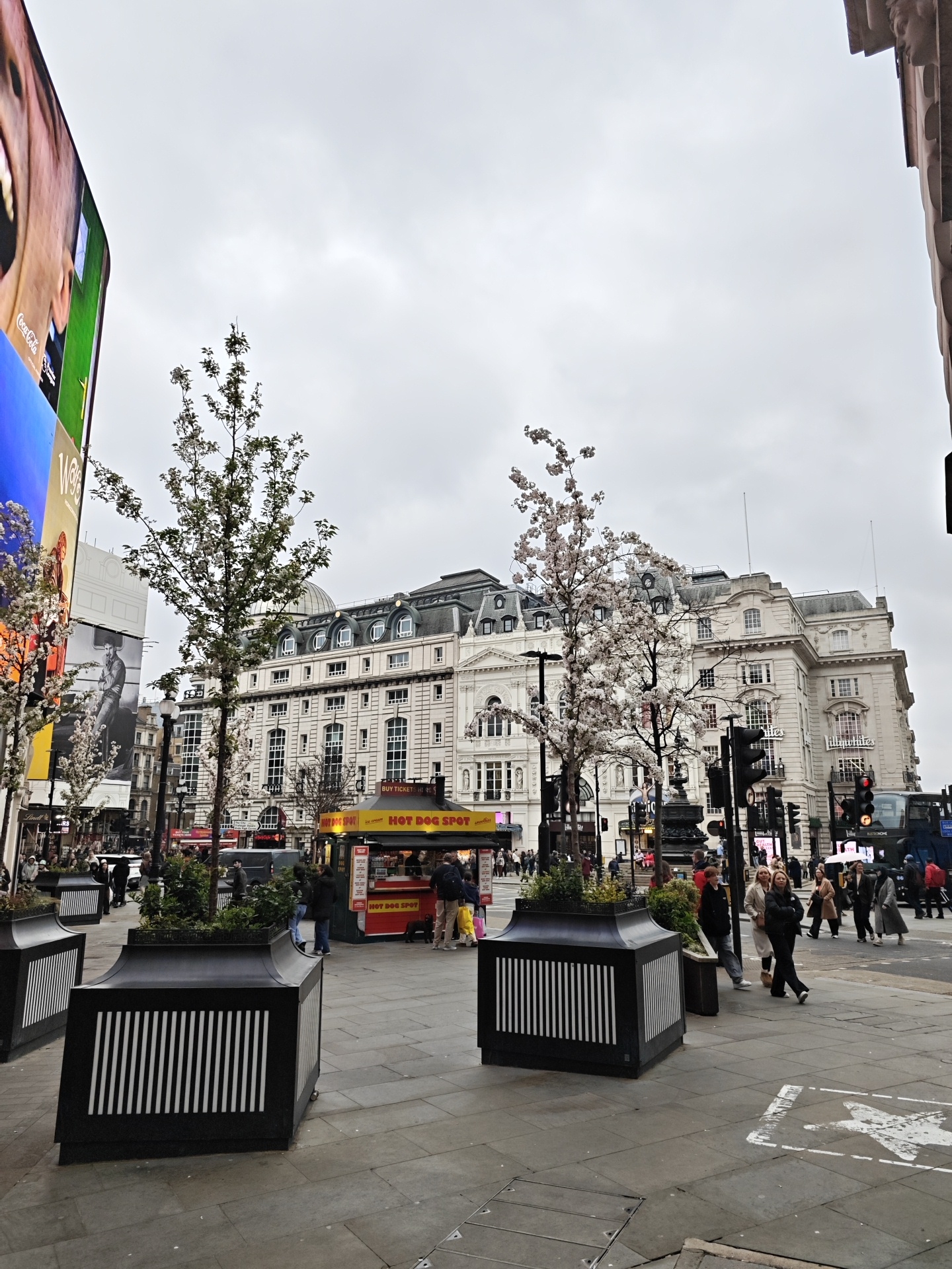 The image displays Piccadilly Circus in London, United Kingdom, under an overcast sky. The foreground consists of a grey paved pedestrian area, punctuated by black planter boxes with white vertical slats, each containing small trees or shrubs, some bearing white blossoms. A "HOT DOG SPOT" food stall, identifiable by its yellow roof and red base, is positioned centrally, with several individuals congregated around it. To the left, a prominent, curved digital billboard exhibits various advertisements, including a close-up of a face and "Coca-Cola" branding. Numerous pedestrians are visible across the scene, walking in various directions on pavements and near street crossings. In the midground and background, ornate, multi-story white stone buildings with classical architectural elements, including a visible dome, line the intersection. Traffic lights, some displaying red, are present, and a red double-decker bus is partially visible on the right. Elements of the Shaftesbury Memorial Fountain are discernible amidst the street furniture and trees. The scene depicts a busy urban environment with commercial activity and significant pedestrian traffic.