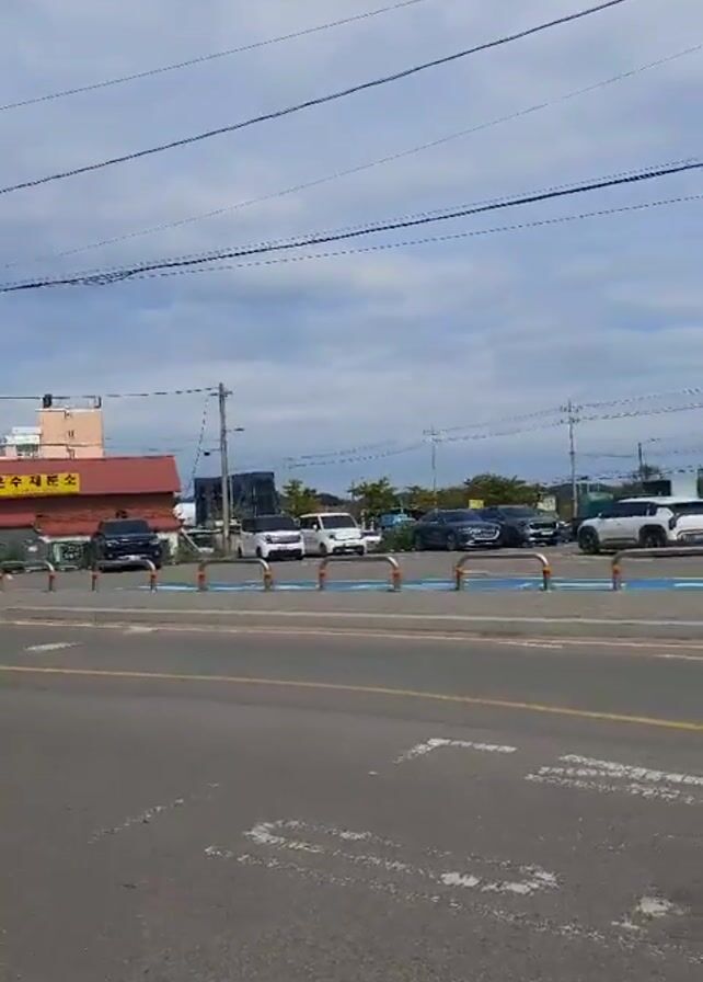 street scene in South Korea on a cloudy day. The camera pans slowly to the right. On the left side of the street is a red-roofed building with signage in Korean. A parking lot is visible with several cars parked. On the right side of the street is a multi-story white building with various signs, including a dental office. A bus stop is also visible, with advertisements. The street is paved with a painted crosswalk. Power lines crisscross above the scene. The overall environment appears to be a typical small town or suburban area. The audio captures ambient sounds, including people speaking in Korean.