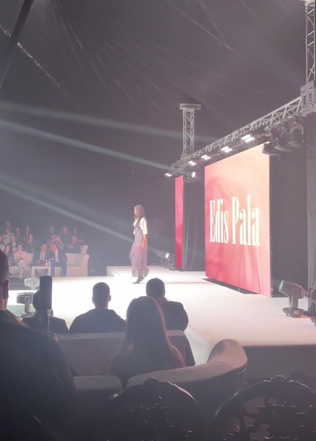 fashion show taking place in a large tent-like structure. A female model is walking down a white runway, wearing a white top and a long purple skirt. The words "Edis Pala" are displayed on a large red screen behind her. There are people sitting in the audience, watching the show. Many are dressed formally, and at least one person is holding up a phone to record. Stage lighting rigs can be seen above the runway.