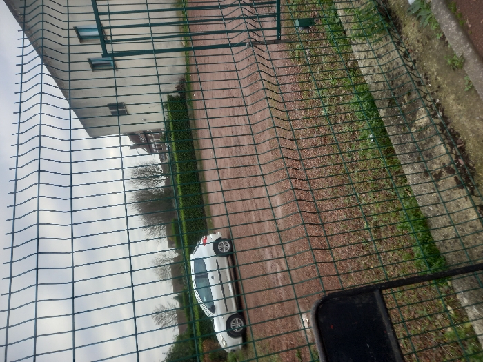 The image depicts an outdoor scene in Noyelles-sous-Lens, France, viewed through a green wire mesh fence. The fence, acting as the primary foreground element, features vertical and horizontal wires creating a grid pattern, with a concrete curb and sparse ground vegetation immediately beneath it. A black object, resembling the back of a chair, is partially visible on the far left. Beyond the fence lies an unpaved, reddish-brown gravel or dirt lot. A white two-door hatchback car, possibly a Peugeot model, is parked on the left side of this lot, oriented with its driver's side facing the viewer. Behind the lot, a manicured green hedge stretches across the midground. In the background, to the right, stands a light-colored building with a visible section featuring two windows, one with a dark covering and another with light blue framing. A dark green metal gate is positioned to the right of this building. Further left, a multi-story house constructed of red brick with a dark roof is visible behind the hedge. Several deciduous trees, currently without foliage, are scattered in the distant background against a uniformly overcast sky. No individuals are present in the scene, and no overt actions or interactions are depicted. The environment appears to be an urban or semi-urban area, possibly a private or commercial lot adjacent to residential structures.