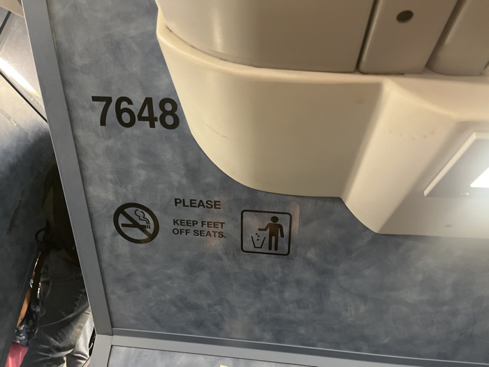 This image displays the interior of a public transportation vehicle, located within the city of Edison, United States. The scene is dominated by a textured blue-gray wall panel, marked with the black numbers '7648'. Below the numbers, three distinct black-on-white notices are present: a 'no smoking' icon (a cigarette within a circle crossed by a diagonal line), the capitalized text 'PLEASE KEEP FEET OFF SEATS.', and a 'litter' icon (a stylized human figure dropping an item into a trash receptacle within a square border). Above this panel, a curved, off-white overhead structure, possibly part of a luggage rack or ceiling, occupies the upper right portion of the frame, showing a bright, rectangular light fixture. In the lower-left corner, the lower torsos and legs of two individuals are partially visible. One person is dressed in blue jeans and a dark top or backpack, standing adjacent to the panel. Behind them, another person is partially obscured, wearing patterned clothing. No active interactions or specific actions are evident.