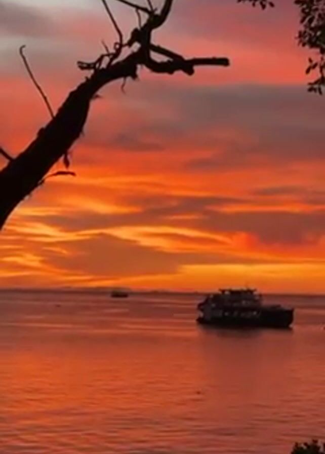 sunset at sea. The sky is orange and red, with some purple hues near the top. A large boat is sailing on the water, which reflects the colors of the sky. A tree branch is silhouetted in the foreground, and there is some greenery on the right side of the frame.