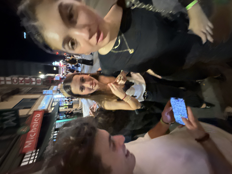 The image captures a nighttime street scene on Tremont Street in Boston, Massachusetts, identified by visible signage for "TAM" (a bar), a vertical "TICKETS" sign, and a "Michelob" sign on a building. In the foreground, three individuals are visible. On the left, a male with dark, curly hair and a light-colored shirt looks down at a horizontally held smartphone, which displays a bright blue and white textured image on its screen. He wears a red bracelet on his right wrist and a neon green wristband on his left wrist. In the center, a female with long, brown hair, wearing a white and black patterned top and dark pants, smiles directly at the camera. She wears multiple rings on her fingers, several red bracelets on her left wrist, and a neon green wristband. On the right, a female with dark hair pulled back, wearing a dark top and dark pants, also looks towards the camera. She has a gold-colored necklace with a small pendant and a neon green wristband on her left wrist. The background is a blurred urban streetscape with multiple-story buildings, various illuminated storefronts including "New York Pizza," and numerous indistinct pedestrians. The scene is lit by artificial streetlights and commercial signs, indicating a busy city environment after dark.