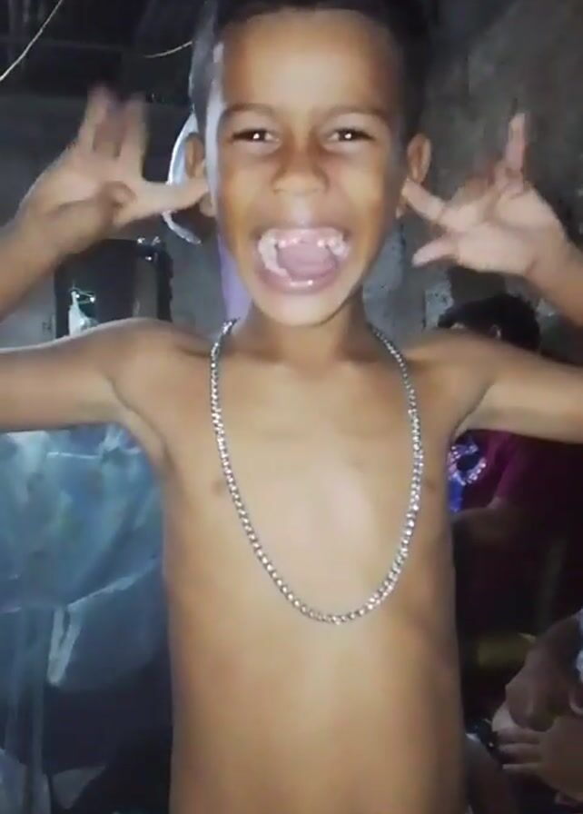 A young boy stands in the center of the frame, shirtless and wearing a silver chain. He is making faces at the camera, holding his hands up with his fingers extended, and sticking his tongue out. He is wearing patterned shorts. Behind him, blurry figures of people can be seen. The background appears to be a simple room with corrugated metal sheets for a ceiling. A plastic bag hangs from above. The lighting is dim. The camera is positioned at a medium distance.