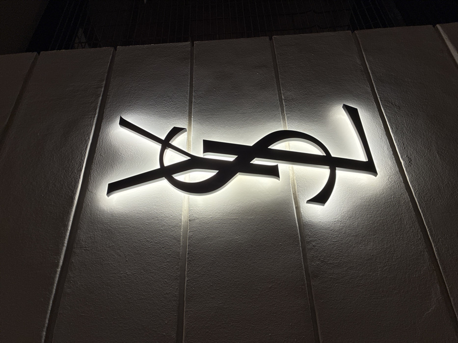 - "A large, illuminated Yves Saint Laurent (YSL) monogram logo is prominently displayed on a textured, light-colored building facade at night" by FM-41wDv1, licensed under CC BY 4.0