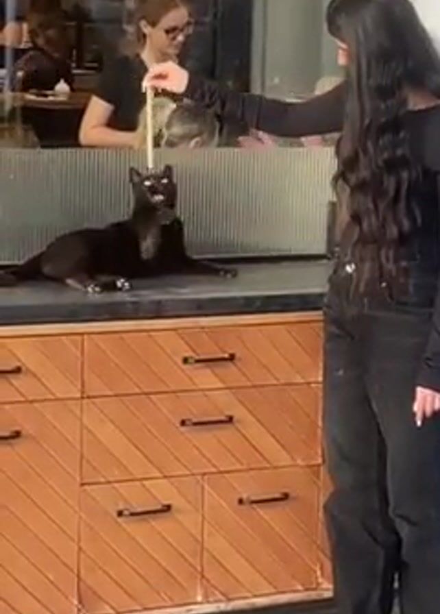 A woman with long dark hair stands outside a window, holding a tan-colored dowel rod in her hand. She’s wearing a long-sleeved black shirt, dark jeans, and tan-colored boots. On the other side of the window, a black cat with white socks on its front paws lies on a countertop that sits atop a wooden cabinet with several drawers. The woman waves the dowel rod in front of the cat, trying to entice it to play. In the background, inside the building, two people are visible. One woman with blonde hair tied back is looking at the cat and the person outside, while another person sits in the background. The setting appears to be outside a cafe or restaurant, based on the interior decor and bar area visible through the window.