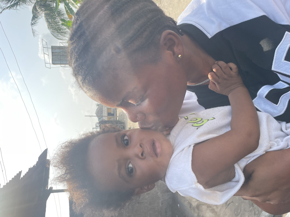 The image captures an adult female holding an infant outdoors in Badagry, Nigeria, under a bright, clear sky