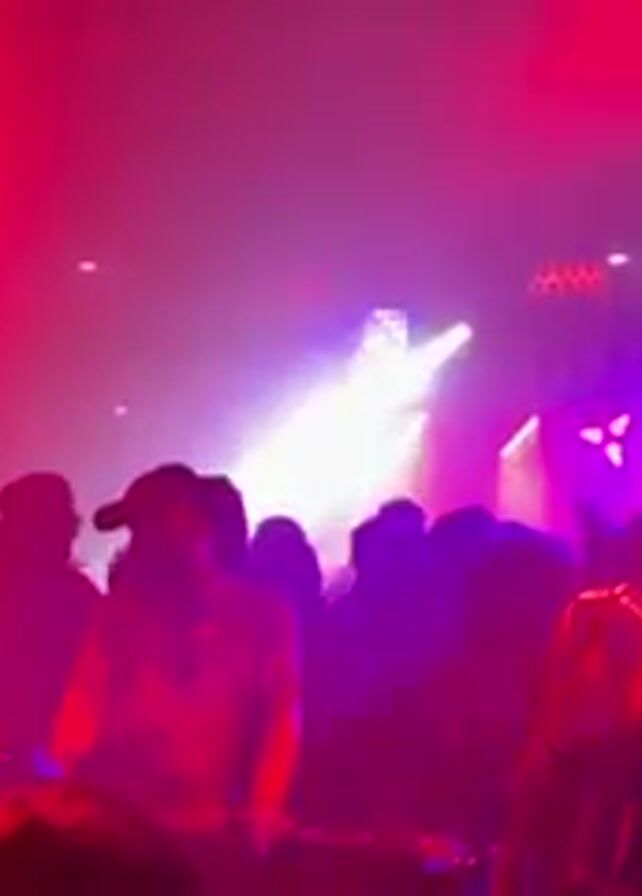 A crowd of people is dancing and enjoying themselves at a nightclub or music venue with red and purple lighting