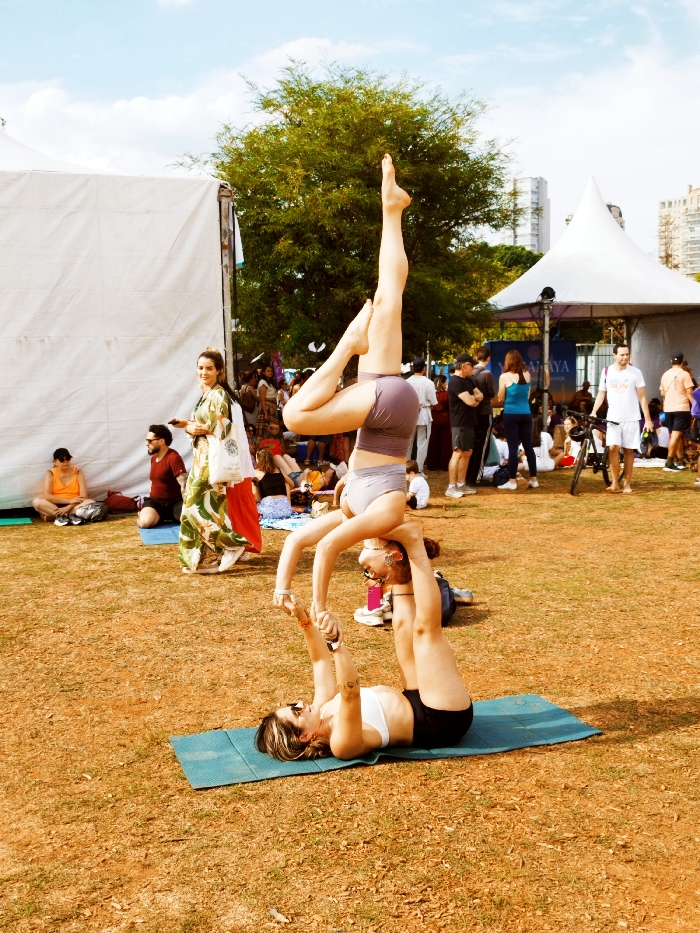 This image captures an outdoor wellness event, likely a yoga or acroyoga gathering, taking place in Ibirapuera Park, São Paulo, Brazil