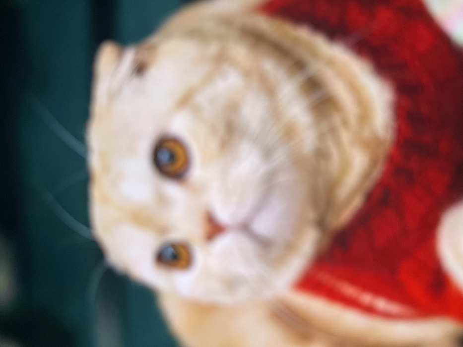 A blurry, close-up image features a light orange cat with darker stripes on its head. The cat has striking, round eyes with amber irises and small pupils. The cat’s nose is small and pink. A blurry red garment surrounds the cat's neck area. The background is out of focus with a blend of dark green, and hints of other colors. The cat’s head is tilted to its right, looking towards the viewer with a soft expression.