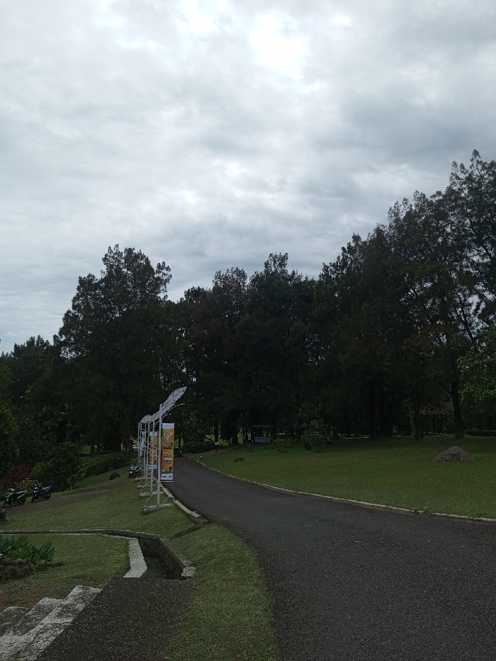 An asphalt road curves through a park-like setting with manicured green lawns and tall, dense trees under a cloudy sky. On the left, there are several posters on stands and motorcycles are parked. A set of stone steps descends into the scene. A small building or gazebo is visible further down the road on the right.