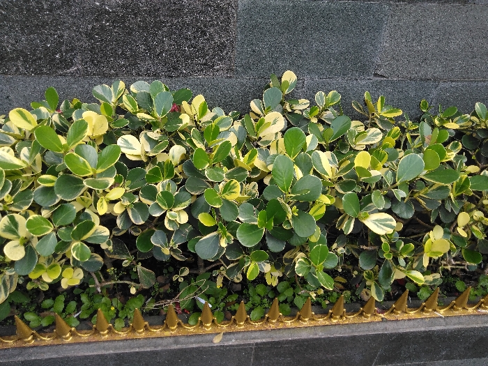 A close-up, ground-level view depicts a vibrant plant bed situated against a dark grey, textured wall in San Cristóbal, Costa Rica. The primary subject is dense, variegated foliage, characterized by numerous small, rounded leaves displaying a mottled pattern of dark green and bright yellow or lime green. These plants, possibly *Clusia rosea 'Nana'*, fill the mid-ground of the image. Below the dense foliage, a sparse layer of smaller green ground cover is visible, along with some exposed soil. In the immediate foreground, a dark grey horizontal base, likely concrete or stone, supports a continuous strip of decorative golden spikes, pyramid-shaped and pointed upwards, forming a protective or ornamental barrier for the plant bed. No individuals, animals, or specific actions are discernible within the frame.