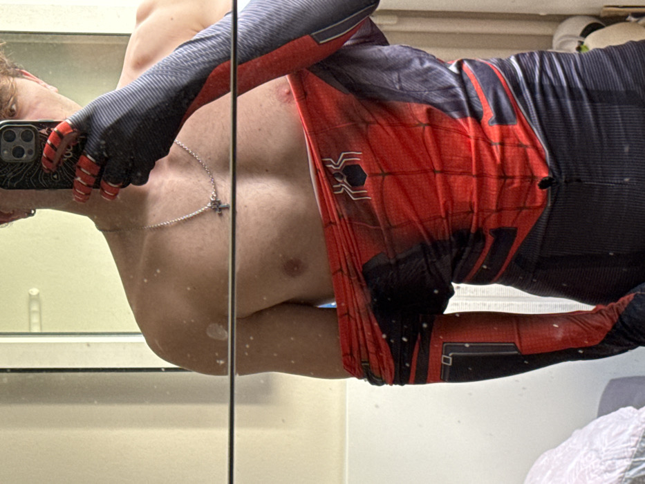 A male individual is depicted in a mirror selfie, primarily showing his bare torso, his right arm, and his left hand, in an indoor, likely residential, setting within Rennes, France. The man possesses a muscular physique, with his chest and abdomen exposed. He wears a silver chain with a small cross pendant around his neck and an earring in his visible left ear. His face is partially obscured by a dark-colored smartphone, held in his right hand. The phone features multiple camera lenses and a textured case. His right hand is encased in a red and black Spider-Man costume glove. The individual is in the process of putting on or taking off a red and black Spider-Man suit, which is pulled down from his shoulders, revealing his upper torso. The suit's red front section displays a black and white spider emblem, and the visible left arm is fully covered by the costume's textured sleeve. The background, reflected in the mirror, shows light-colored walls, a vertical white door frame or wall edge, and a blurry section potentially indicating a bed with white bedding or other furniture. The mirror surface exhibits numerous small white specks. The precise address or external context within Rennes is not visually ascertainable from the image content alone.
