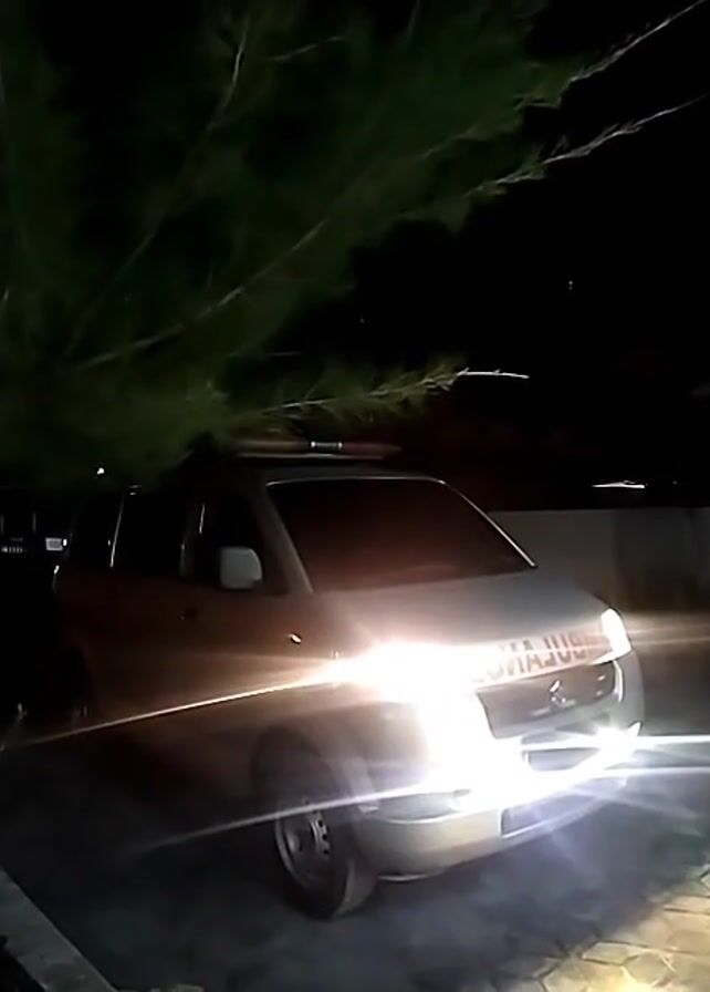At night, an ambulance sits parked under a tree