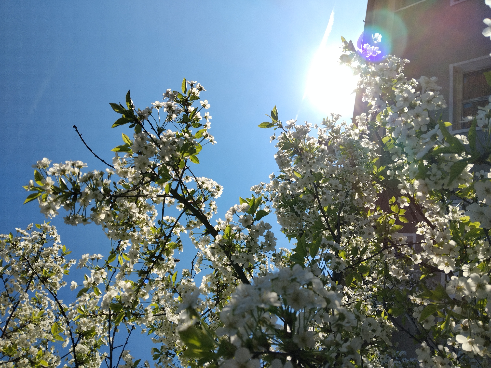- "A low-angle shot of flowering branches against a bright blue sky and the sun" by FM-9ghlT2, licensed under CC BY 4.0