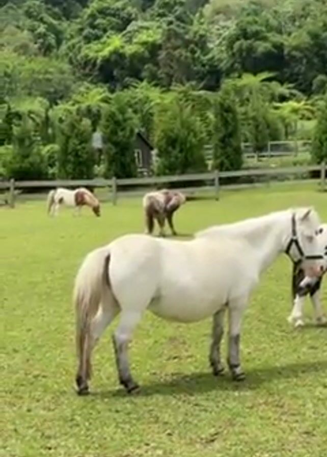grassy field with several ponies grazing, with a forest and mountains in the background. A wooden fence runs through part of the field. The closest pony is white with a pale mane and tail, and is wearing a black halter. Another pony is black and white and further away. In the background, a brown and white pony is grazing. There is a small dark building behind the fence. The grass is green and the sky is overcast.