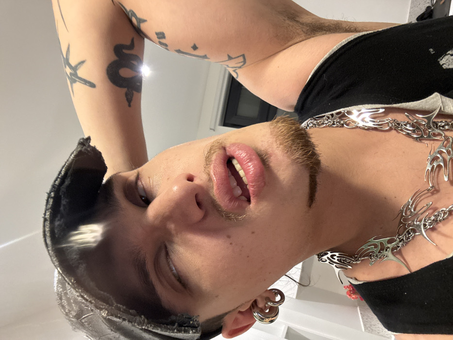A close-up, low-angle portrait captures a young adult male with light skin, a goatee, and a mustache