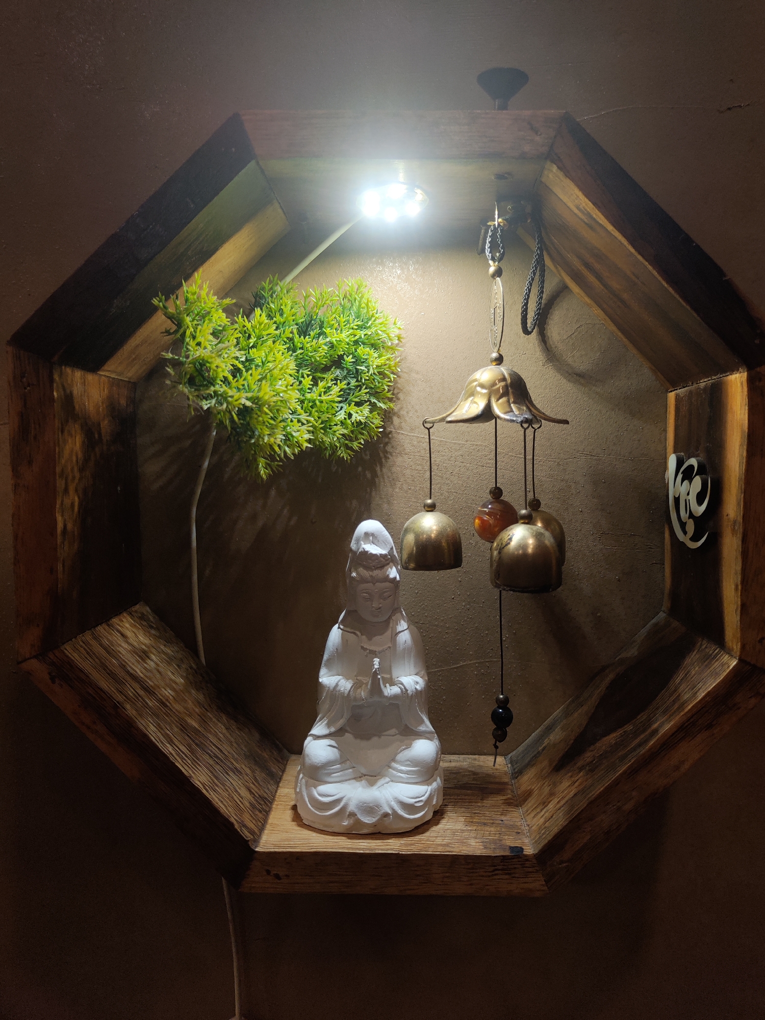 An octagonal wooden shelf with a light at the top center contains a white Buddha statue, a small artificial green bush, and wind chimes