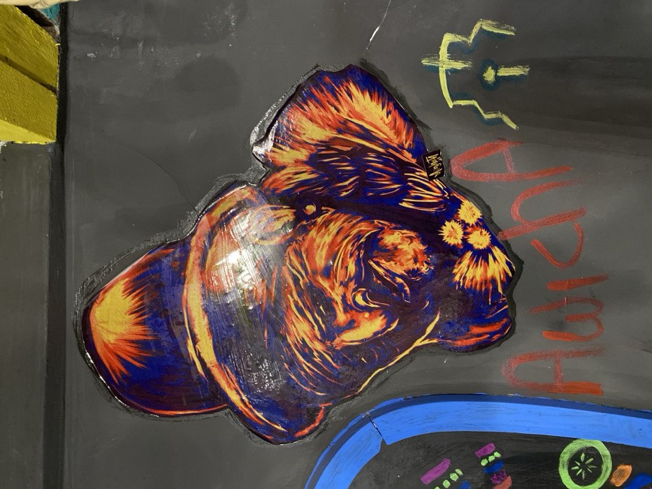 The image displays a segment of street art or a mural on a dark gray surface, likely a wall