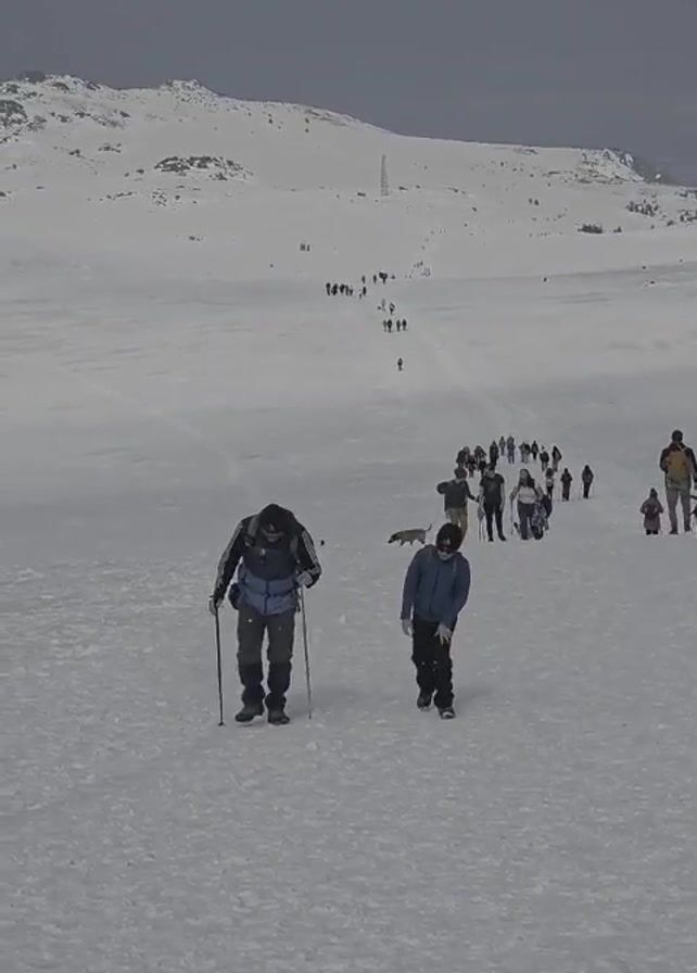 A medium shot depicts a procession of people walking through a snowy landscape, likely engaged in hiking. Two figures are in the foreground, one using walking poles, the other without. In the background, a long line of individuals extends toward a snow-capped mountain under an overcast sky. The snow is lightly marked with footprints, and a few dogs appear to be accompanying the group. The overall scene suggests a group activity or guided tour in a mountainous, winter environment.