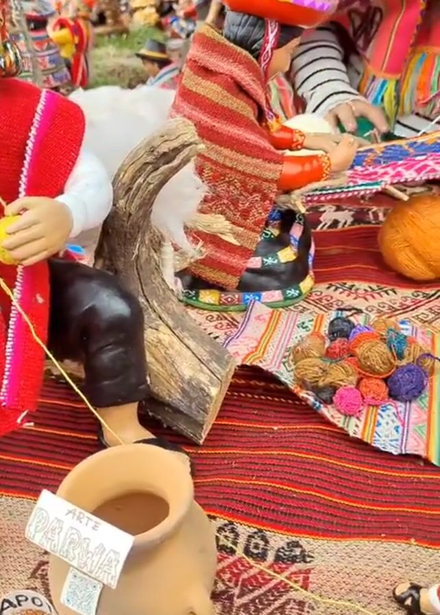 display of Peruvian folk art. The focus is on a set of handcrafted figurines depicting people engaged in traditional weaving activities. One figurine, wearing a black hat and a red poncho, is shown winding yarn. A second figurine is seated at a loom, seemingly in the process of weaving. The display is set on a colorful woven textile and includes balls of yarn, wooden tools, and small clay pots. A sign labeled "Arte Darwa" and a list with the heading "ARTS PARWA" are also visible. The setting appears to be an outdoor market or fair.